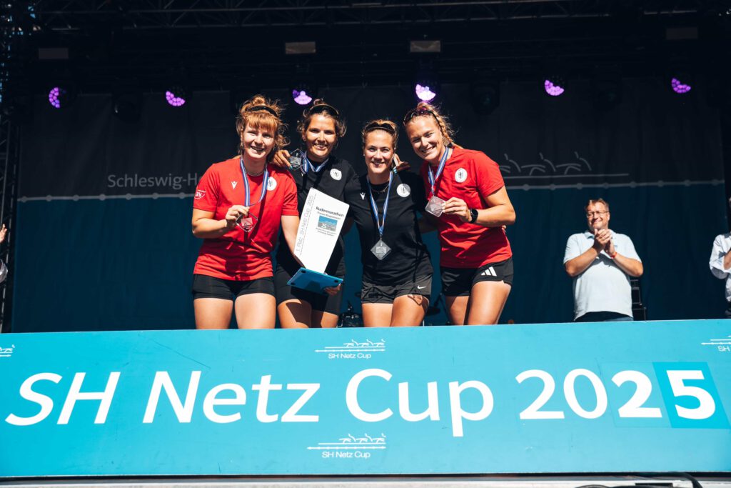 Cup-Organisator Florian Berndt freute sich, zum Jubiläum erstmals auch die Frauen-Doppelvierer in Rendsburg begrüßen zu können. „Das zu koordinieren, war durchaus ein Wagnis. Aber es hat hervorragend geklappt“, sagte er im Nachgang. Die Frauen aus dem deutschen Doppelvierer mit Sarah Wibberenz, Frauke Hundeling, Lisa Gutfleisch und Pia Greiten kannten den SH Netz Cup natürlich bereits, haben ihn immer aus der Ferne verfolgt und sich trotz der enormen Streckenlänge sehr auf ihre erste Teilnahme gefreut. „Das war heute schon eine kleine Challenge“, so Sarah Wibberenz während der Siegerehrung nach dem Rudermarathon. „Aber wir haben viel mehr Spaß gehabt als wir zuerst dachten.“